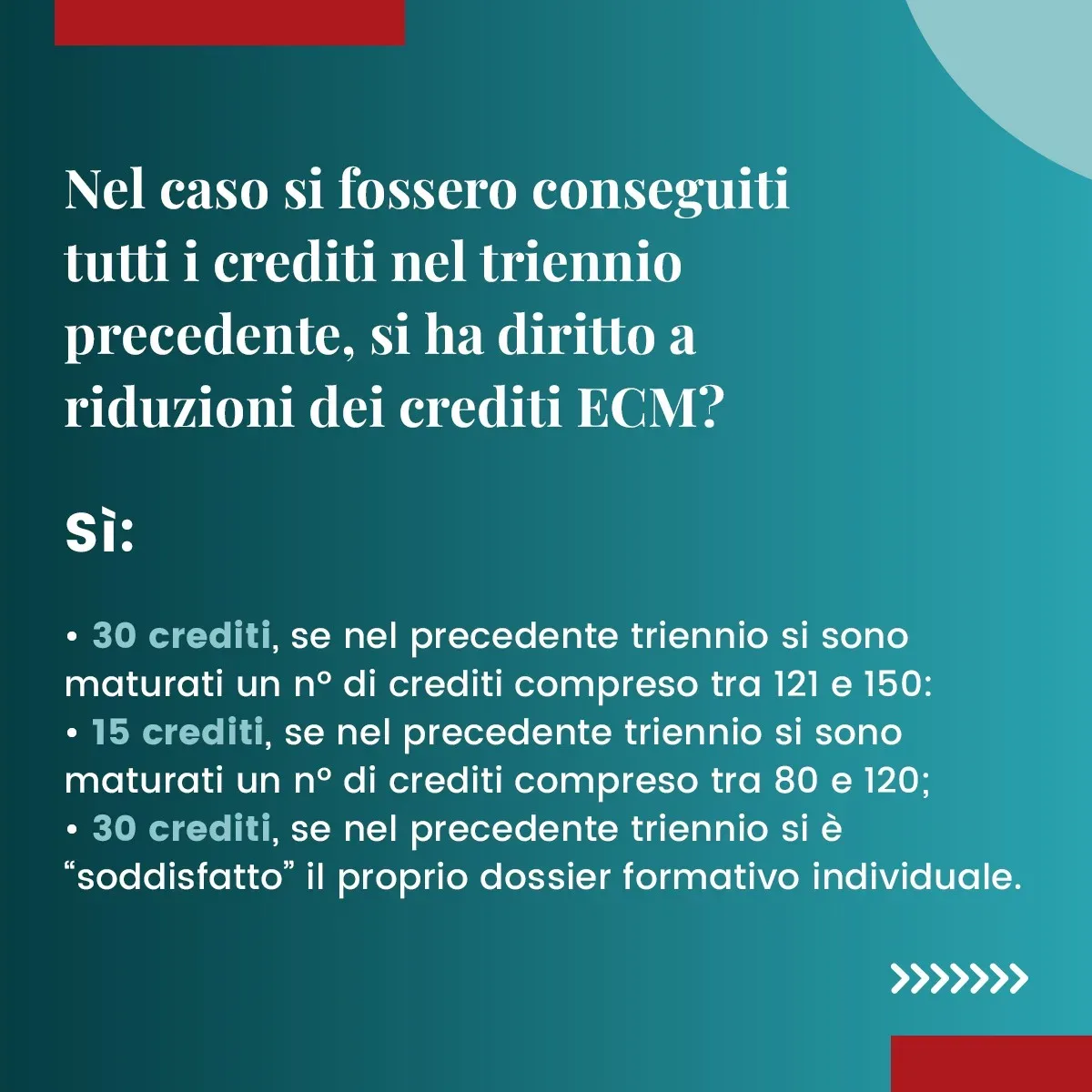 Dal 2017, viene poi introdotto un criterio che premia la regolarità formativa pregressa: chi ha acquisito da 80 a 120 crediti Ecm tra il 2014 ed il 2016, avrà uno sconto di 15 crediti per il nuovo triennio (riduzione da 150 a 135). Chi, invece, ha acquisito da 121 a 150 crediti nel triennio che volge al termine, avrà addirittura uno sconto di 30 crediti tra il 2017 ed il 2019 (da 150 a 120).
